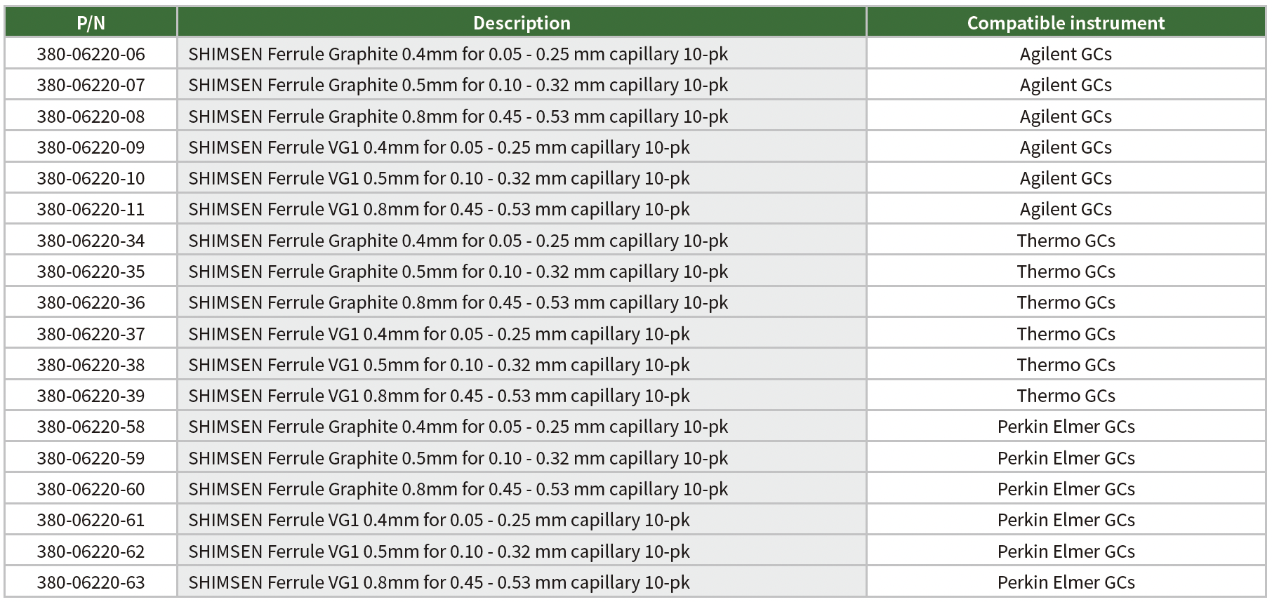 - The SHIMSEN GC consumables are available in graphite material (100% Graphite) and VG1 material (85% Vespel+15% Graphite).
